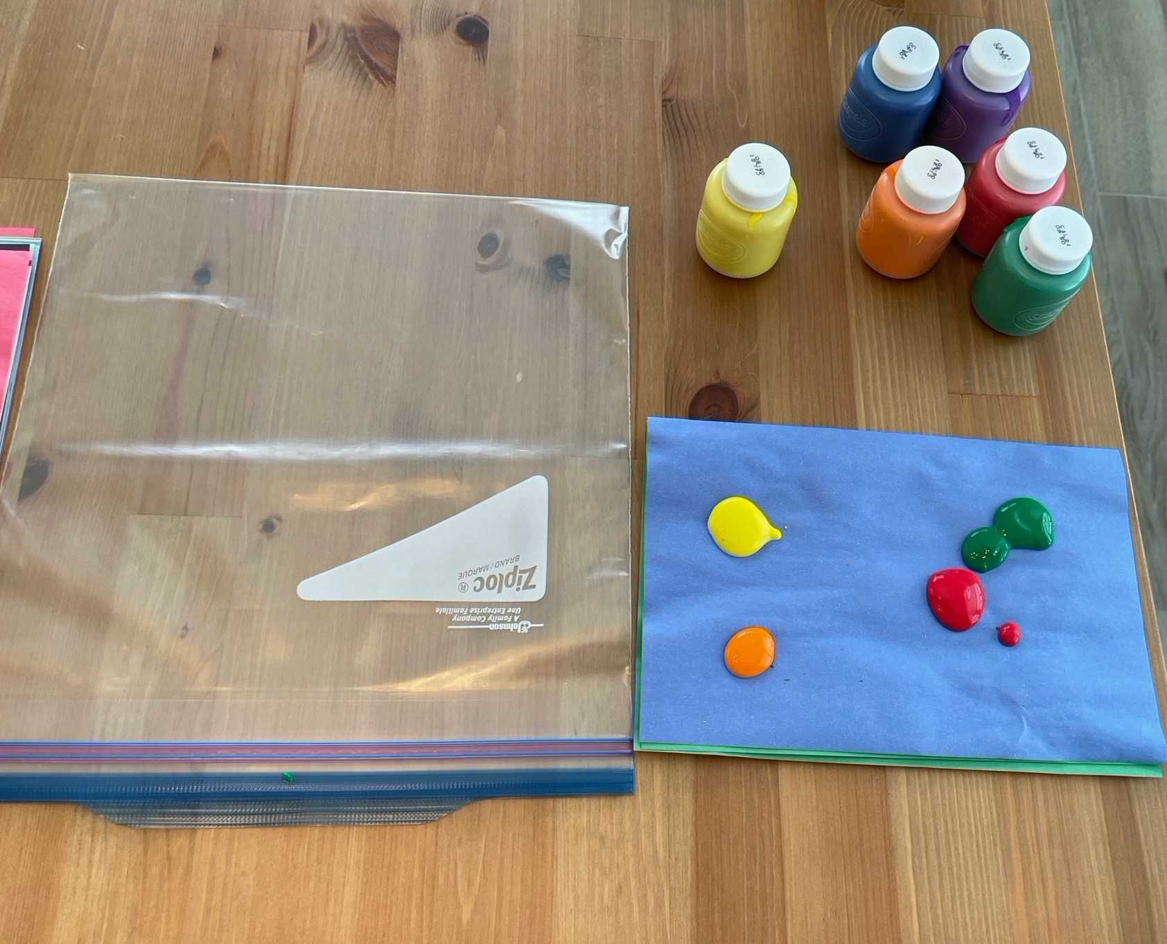 Place the paper with paint into the Ziplock freezer bag and close the bag. You can use tape to secure the bag to the table, if you wish.