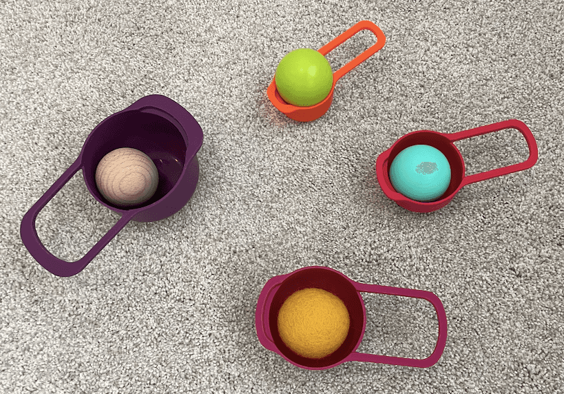 And, of course, there’s “hide and seek.” Hide a ball under each cup and have baby find them.