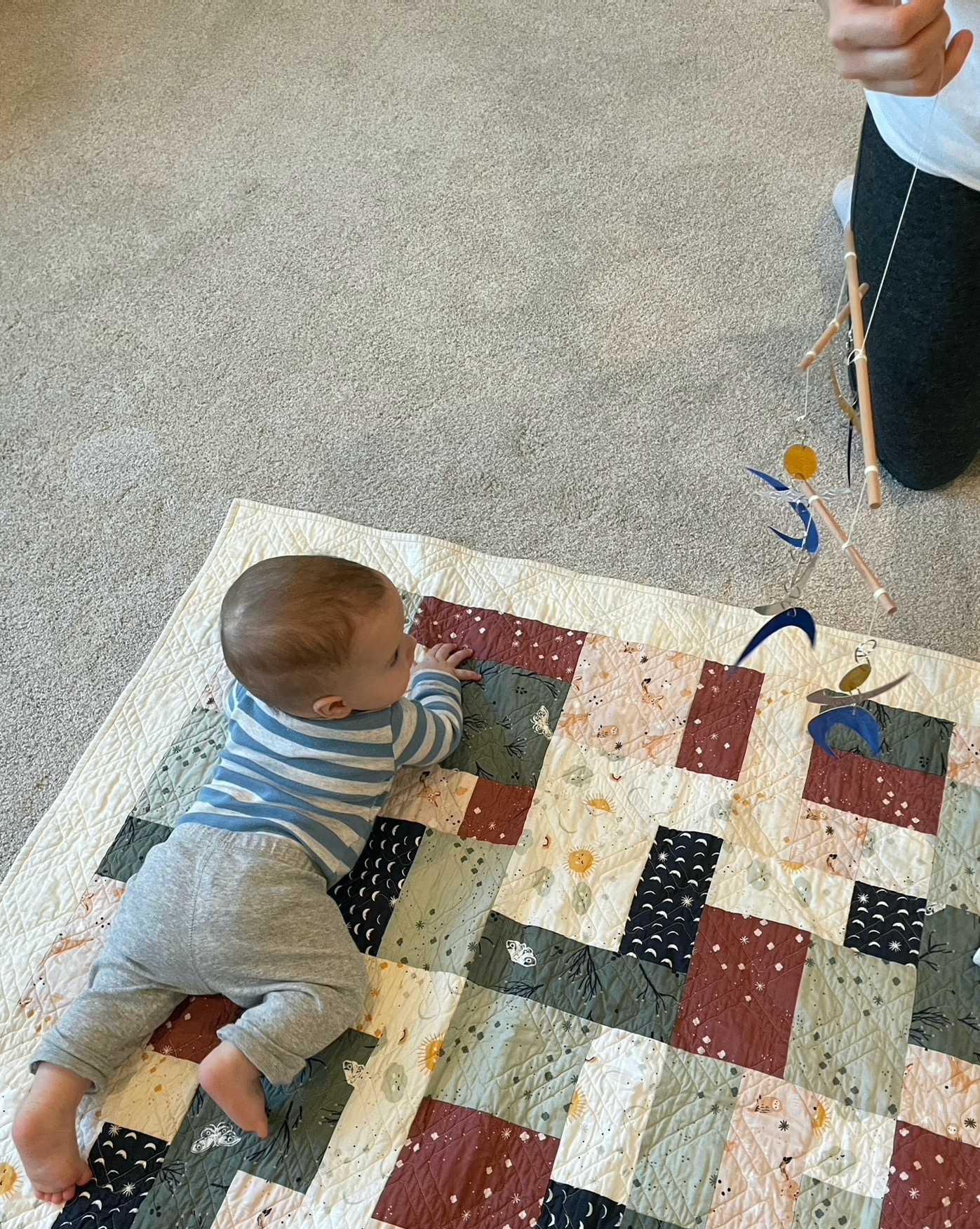 Once baby is on his tummy, dangle a mobile in front of him. Then, slowly move (with the mobile in hand) to one side. Baby will follow by rotating on their tummy. Keep moving and baby will keep following the mobile.