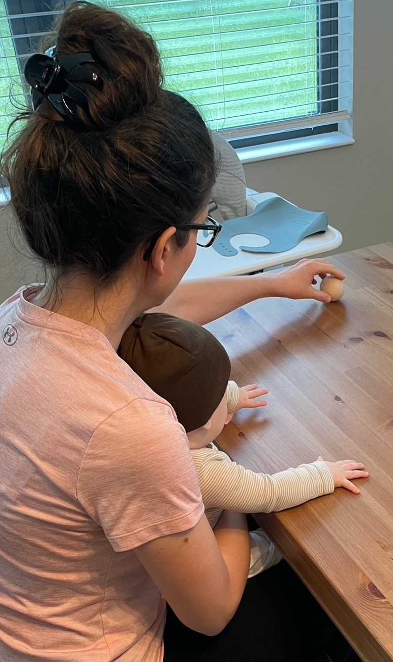 Here’s how it works. Sit at a table, like your kitchen or dining room table, with baby on your lap.