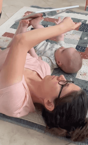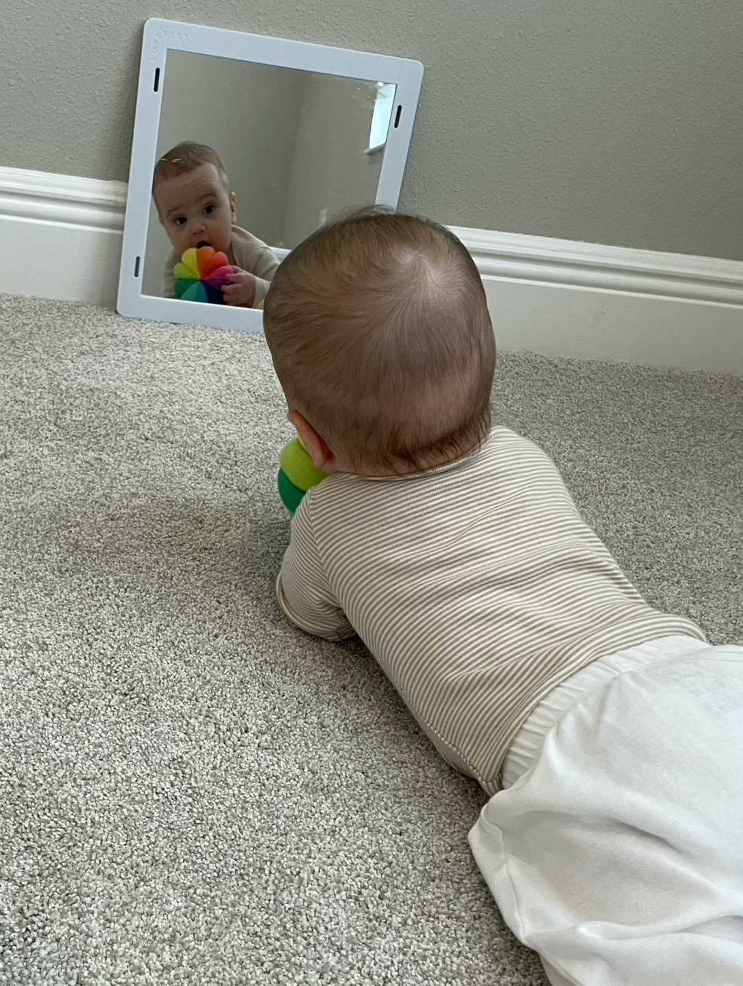 Not only does baby love looking at himself in the mirror. But it’s also a great way to encourage baby to move.