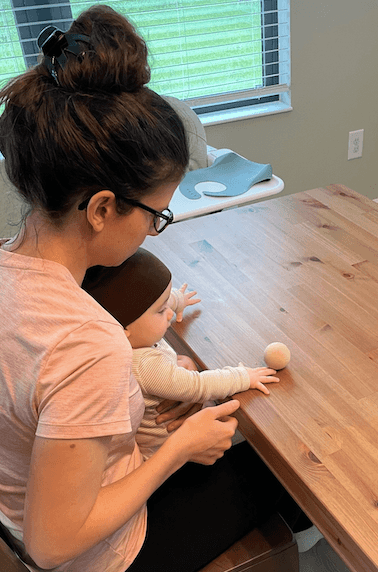 It’s hard to do because a ball rolls, and can be hard to grasp. But this gives baby great practice in building hand-eye coordination.