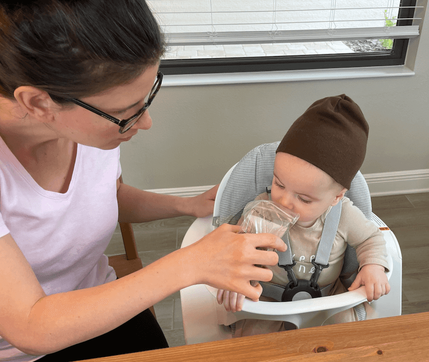 Now that Hayden can sit in his high chair, he “helps” me prepare food like his banana puree. He’s also “helped” me make brownies and pumpkin bread.
